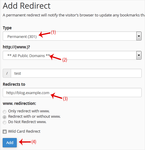 3. Em Adicionar redirecionamento , você deve inserir os seguintes detalhes e escolher as opções apropriadas.