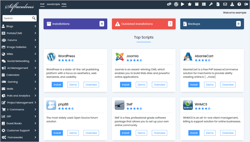 Softaculous é um instalador de script de um clique que automatiza a instalação de aplicativos da web em um site. Você pode acessá-lo via cPanel.