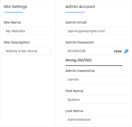 - Nome de usuário administrador: seu novo nome de usuário Pubvana (por motivos de segurança, não use o administrador ou o nome de usuário admin).